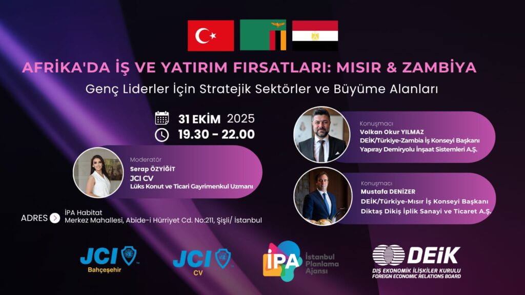 JCI Bahçeşehir ve JCI CV tarafından önceki gün İstanbul’da düzenlenen “Mısır ve Zambiya’da İş ve Yatırım Fırsatları” konulu panel iş dünyasının geniş katılımıyla gerçekleştirildi. Açılış konuşmasını yapan JCI CV Başkanı Ezgi Kalender, Mısır ve Zambiya’nın Türk iş insanları açısından yatırım yapmaya elverişli ülkeler arasında bulunduğunu söyledi. Kalender, iki ülkenin dinamik nüfusu ve zengin yeraltı kaynaklarıyla Türk iş dünyası açısından cazibe merkezi konumunda olduğunu belirtti. JCI Bahçeşehir Başkanı Aygün Pelvan iki ülkeye yönelik olarak Türkiye’den gerçekleştirilen yatırım miktarının her geçen gün arttığını kaydederken, JCI Türkiye Yönetim Kurulu adına konuşan Burcu Çoban ise Türk şirketlerinin uluslararası alanlara açılma konusunda iştahının yüksek olduğunu ifade etti.