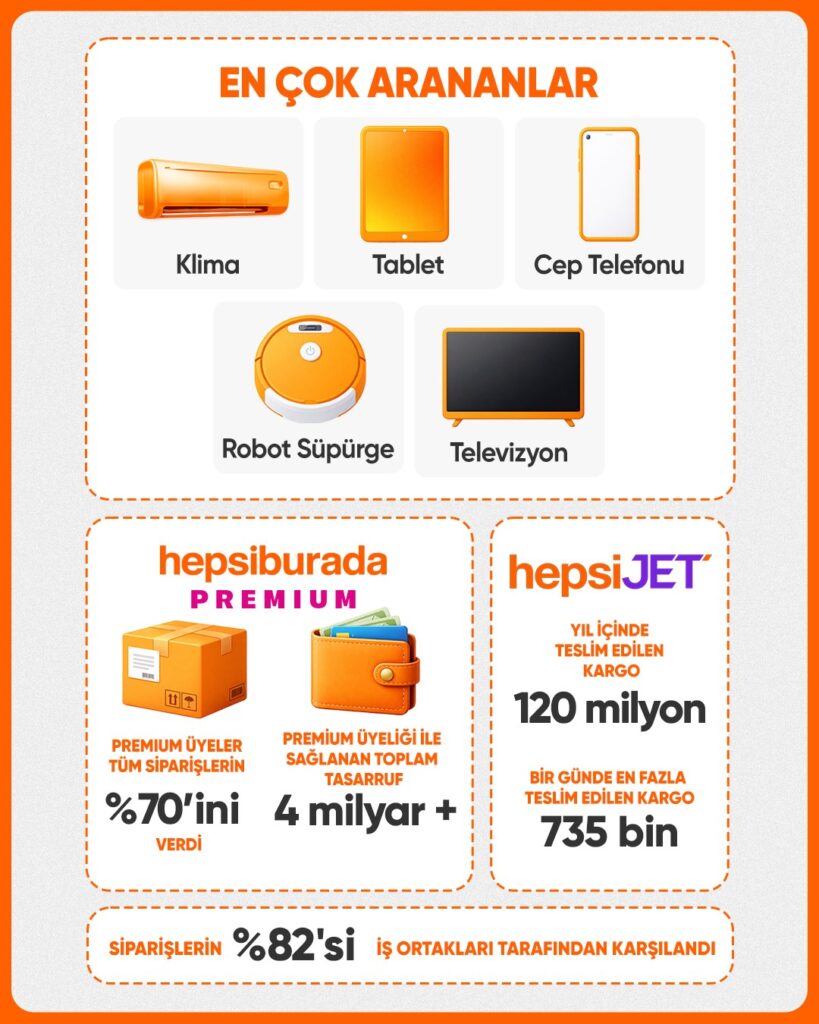Kullanıcıların platformdaki arama davranışları incelendiğinde, marka bazında en sık aratılanlar arasında Stanley, Apple, Dyson, Fissler, Lego ve adidas öne çıktı. Klima, tablet, cep telefonu, robot süpürge, televizyon ve erkek spor ayakkabı yıl boyunca en çok arananlar arasında yer aldı. Hepsiburada’da verilen siparişlerin %82’si iş ortakları tarafından karşılandı.