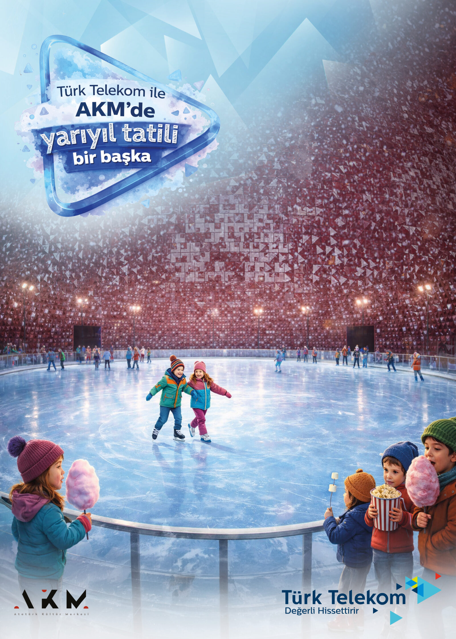 Türk Telekom, “Türkiye’ye Değer” katan projeleriyle kültür ve sanatın kalbi Atatürk Kültür Merkezi’nde (AKM) hayatın her alanına dokunan çalışmalarını sürdürüyor. Yarıyıl tatili kapsamında düzenlediği etkinliklerle öğrencilere eşsiz bir tatil deneyimi sunan Türk Telekom, karnelerini alan çocuklara dolu dolu bir program hazırladı. Buz pistinden sinemaya, çocuk atölyelerinden çeşitli gösteri ve söyleşilere kadar pek çok etkinlik, AKM’de öğrencileri bekliyor.